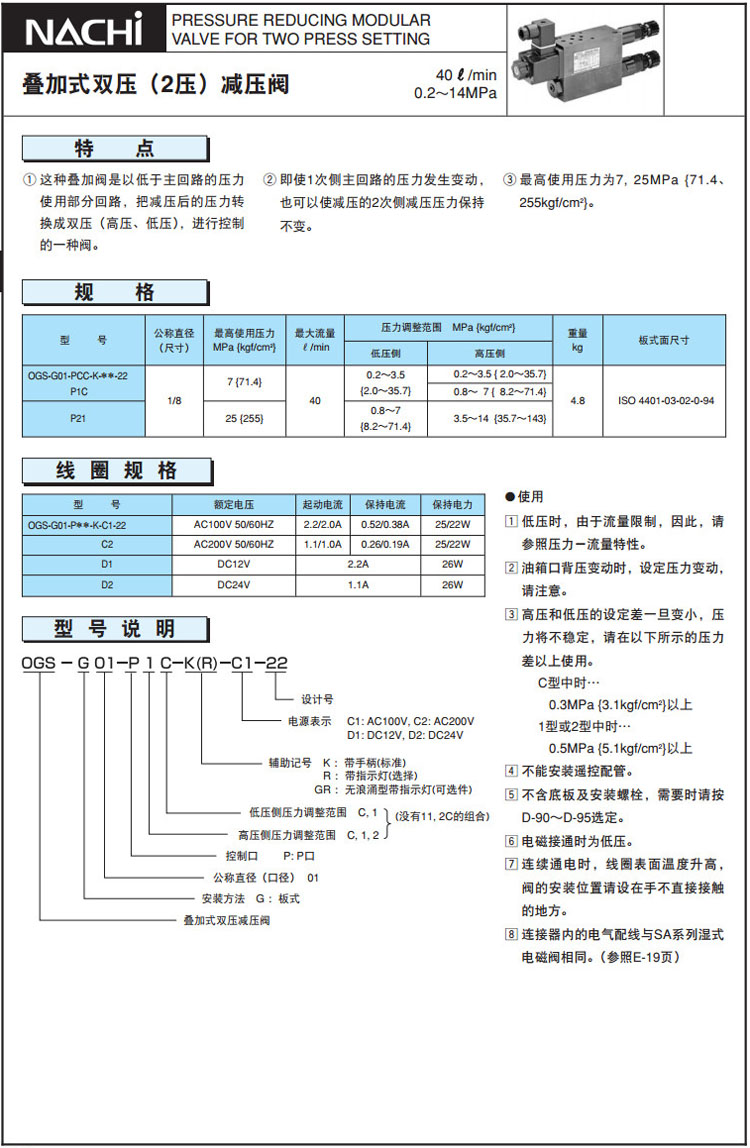 OGS-G01-PCC-K-C1-22,OGS-G01-P1C-K-C1-22,OGS-G01-P21-K-C1-22,NACHI疊加式雙壓減壓閥