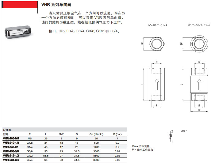 VNR-205-M5,VNR-210-1/8,VNR-843-07,VNR-238-3/8,VNR-212-1/2,camozzi單向閥