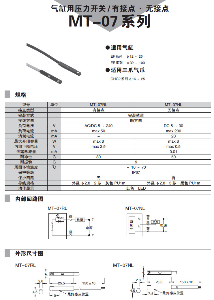 詳細信息 MT-07RL,MT-07NL,氣缸用壓力開關(guān)