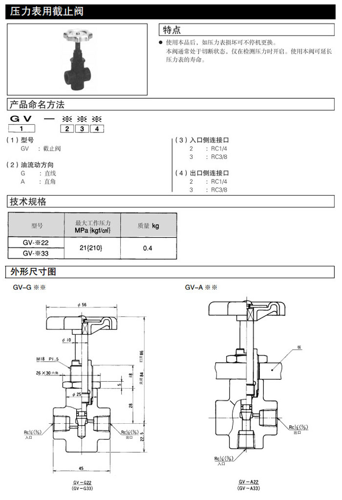 詳細信息 GV-G22,GV-A22,GV-G33,GV-A33,DAIKIN壓力表用截止閥