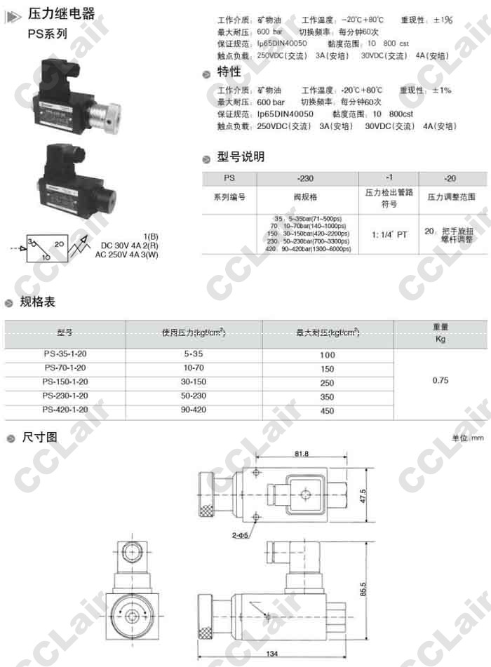 PS-35-1-20,PS-70-1-20,PS-150-1-20,PS-230-1-20,PS-420-1-20,壓力繼電器