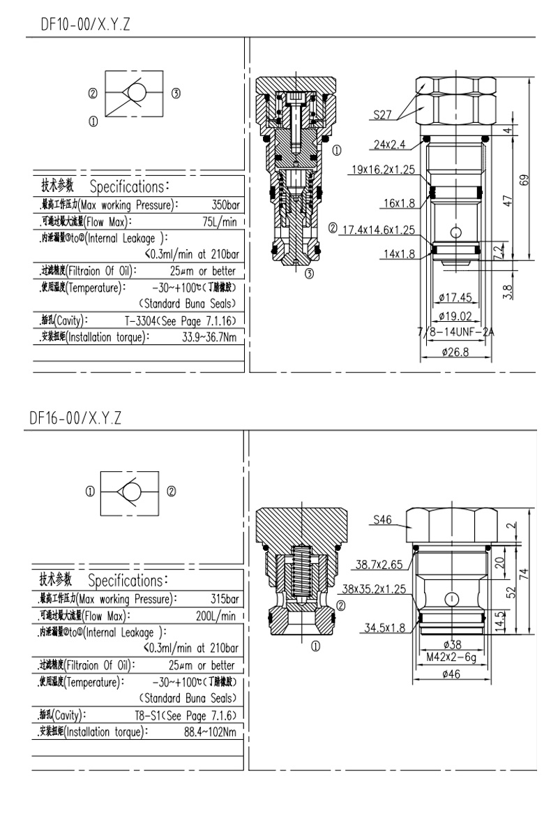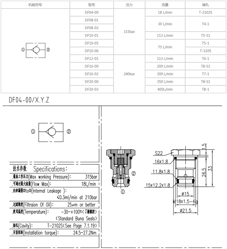 插裝式單向閥 DF04-00 錐閥型 DF08-00 錐閥型 DF08-02 鋼球型 DF10-00 錐閥型 DF10-02 鋼球型 DF12-00 錐閥型 DF12-01 錐閥型 DF16-00 錐閥型 FDF08-00 反向型 FDF10-00 反向型 CV08-20- CV10-20- CV12-20- CV16-20- CV08-21- CV10-21- CCV08-20- CCV10-20- CCV12-20-