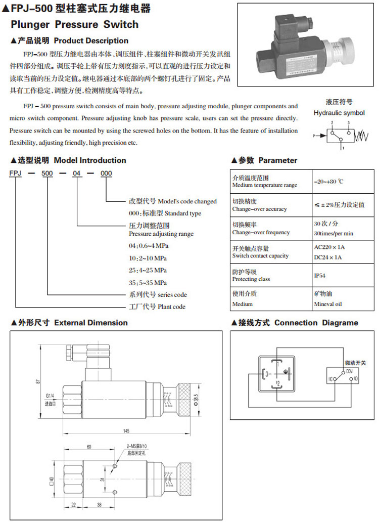 FPJ-500-04,FPJ-500-10,FPJ-500-25,FPJ-500-35,柱塞式壓力繼電器