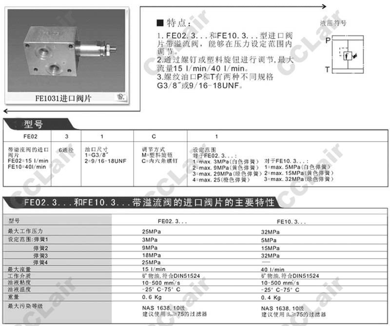 FE0231,FE0232,FE1031,FE1032,帶溢流閥的進(jìn)口閥片