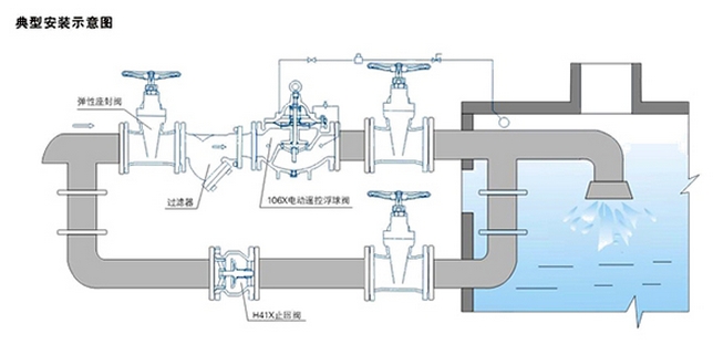 106X電動遙控浮球閥是在100X遙控浮球閥的基礎(chǔ)上添加了常開(常閉)型電磁裝置,使該閥具有雙保險作用,即使停電或電浮球失靈,也能控制水位,絕不會讓水位超過規(guī)定位置,電動浮球閥可以設(shè)置啟閉水位,解決主閥頻繁啟閉。該閥廣泛用于高層建筑、城市生活用水、消防、工礦企業(yè)水池,水塔的進(jìn)水管道中。