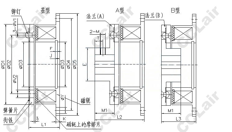 4) 安裝時(shí)不僅要保證磁軛安裝面與軸的垂直度,法蘭與軸的配*用H7/h6,并做好軸向定位,同時(shí)保證圖示δ間隙,法蘭(A)的緊定螺釘在擰入前要涂好防松膠;