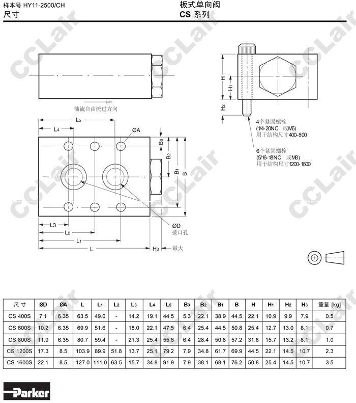 CS400S,CS600S,CS800S,CS1200S,CS1600S,CS400SV,CS400S65,CS400S65V,Parker板式單向閥