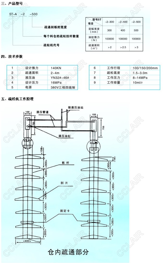 隨著國(guó)內(nèi)火力發(fā)電站不斷向大型化和自動(dòng)化控制發(fā)展,原煤斗尺寸不斷加大,同時(shí),由于直吹式磨煤機(jī)的廣泛應(yīng)用,磨煤機(jī)對(duì)給煤機(jī)平穩(wěn)供煤的要求提高等因素。我廠自主研發(fā)了新一代全自動(dòng)液壓清堵裝置ST-A系列煤倉(cāng)疏松機(jī)。是利用液壓泵站帶動(dòng)液壓油缸拖動(dòng)料倉(cāng)內(nèi)刮板上下移動(dòng)工作,達(dá)到疏松物料的目的。該產(chǎn)品根據(jù)斷煤信號(hào)的傳輸進(jìn)行自動(dòng)啟動(dòng)關(guān)閉及時(shí)疏通物料,在10秒內(nèi)恢復(fù)料倉(cāng)內(nèi)物料流動(dòng),料倉(cāng)恢復(fù)后自動(dòng)停止。