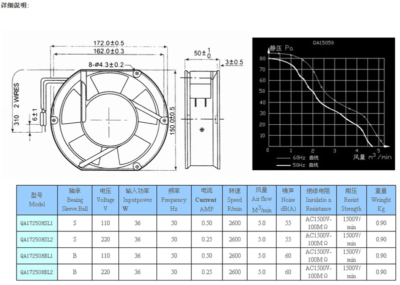詳細信息 QA17250HSL1,QA17250HSL2,QA17250HBL1,QA17250HBL2,交流風機