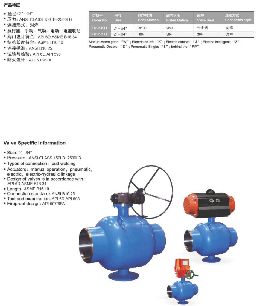 詳細信息 RP-510H-DN50,RP-510H-DN65,RP-520H-DN50,RP-520H-DN65,RP-510H-DN80,RP-510H-DN100,RP-510H-DN150,RP-520H-DN80,RP-520H-DN100,RP-520H-DN150,全焊接管線球閥