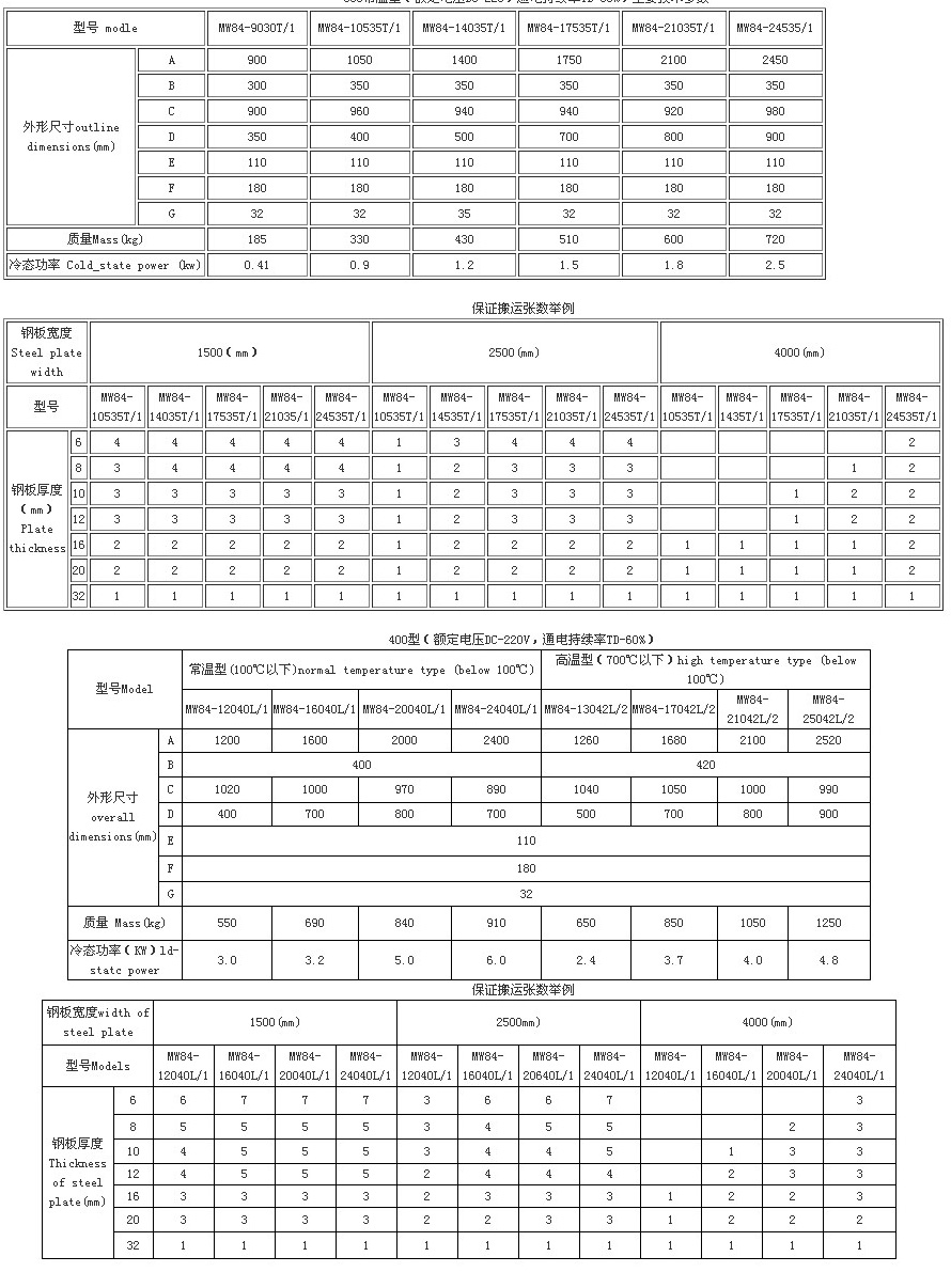 本系列產(chǎn)品是專(zhuān)為吊運(yùn)中厚鋼板而設(shè)計(jì)的。吊運(yùn)作業(yè)安全準(zhǔn)確迅速??紤]到長(zhǎng)鋼板吊運(yùn)可能出現(xiàn)彎曲變形而影響安全搬運(yùn),所以在吊運(yùn)長(zhǎng)尺寸鋼板時(shí),請(qǐng)使用多臺(tái)電磁鐵聯(lián)用。對(duì)于中厚板(6mm-32mm)電磁鐵的間距多取3-4米,兩端外伸部分的長(zhǎng)度可取間距的二分之一。根據(jù)吊運(yùn)張數(shù)的不同,又分為350型和400型兩類(lèi)。350型適合于中厚板長(zhǎng)、造船廠、機(jī)械制造廠,采用調(diào)磁控制方式,能起吊一張或一定張數(shù)鋼板。400型適用于一次搬運(yùn)盡量多的張數(shù),可根據(jù)用戶(hù)要求另行設(shè)計(jì)制造吊運(yùn)700℃一下鋼板用高溫型產(chǎn)品。