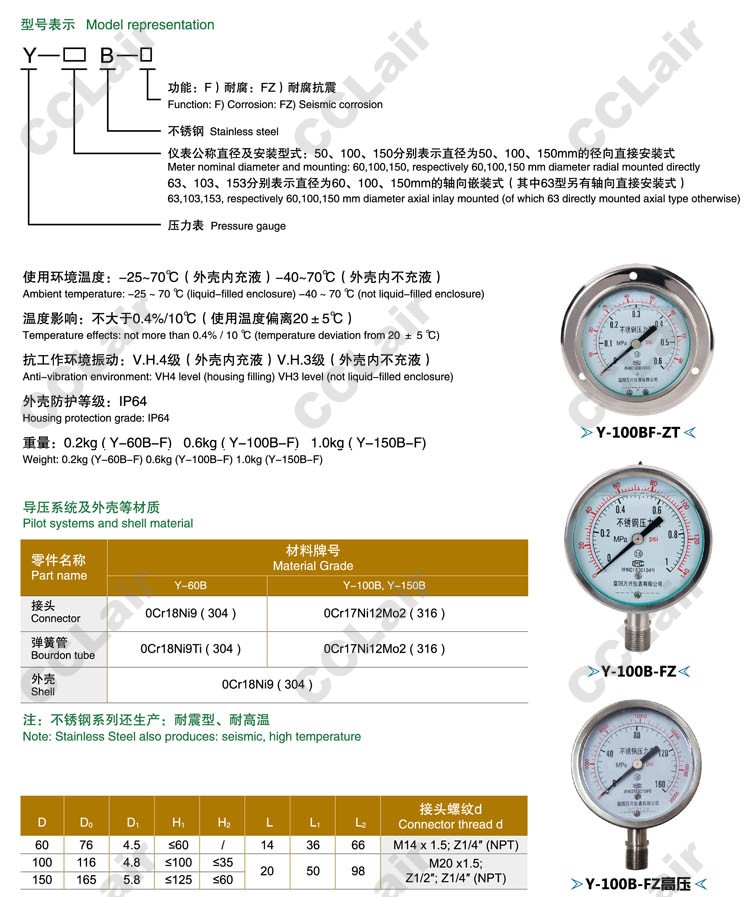 Y-50B-F,Y-60B-F,Y-60B-FZ,Y-63B-F,Y-63B-FZ,Y-100B-F,Y-100B-FZ,不銹鋼壓力表