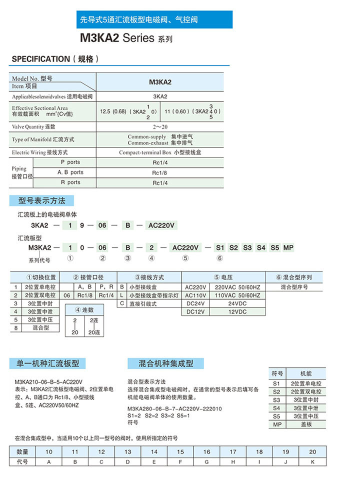 詳細信息 M3KA210-06,M3KA220-06,M3KA230-06,M3KA240-06,M3KA250-06,M3KA280-06,M3KA210-06-B,先導式五通匯流板型電磁閥