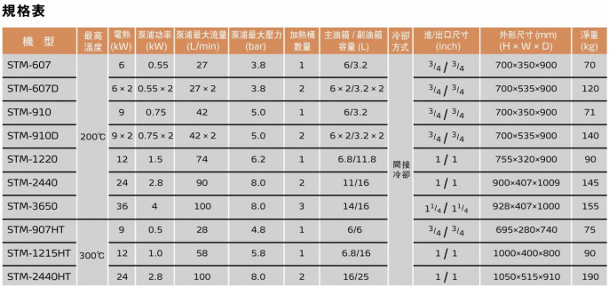 STM-607,STM-607D,STM-910,STM-910D,STM-1220,STM-2440,STM-3650,STM-907HT,STM-1215HT,STM-2440HT油式模具模溫機(jī)