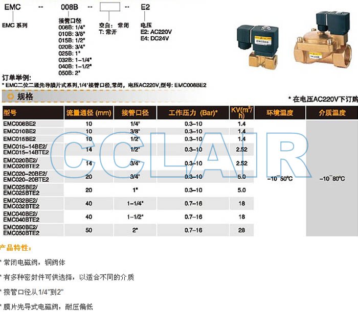 詳細信息 EMC008BE4,EMC010BE4,EMC015BE4,EMC020BE4,EMC025BE4,EMC032BE4,先導(dǎo)膜片式電磁閥