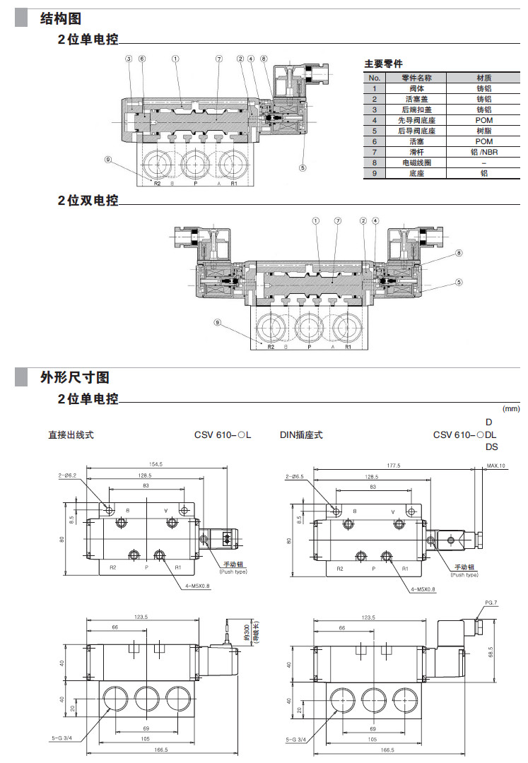 CSV610-1L,CSV620-2L,CSV640-1D,CSV650-2D,CSV630-4DL,CSV640-1DS,5通先導式電磁閥