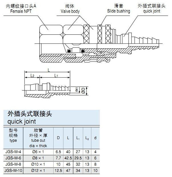 型號規(guī)格說明,下圖例JGS-W-6A(JGS-K-6B)插入式外螺紋接口。高性能快速接頭,外插式內(nèi)螺紋接口。