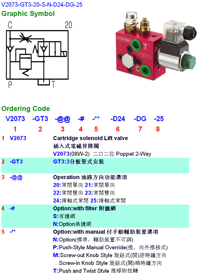 V2073-GT3-21,V2073-GT3-22,V2073-GT3-23,V2073-GT3-24,V2073-GT3-20-S-N-D24-DG-25,HYDROMAX插入式電磁升降閥