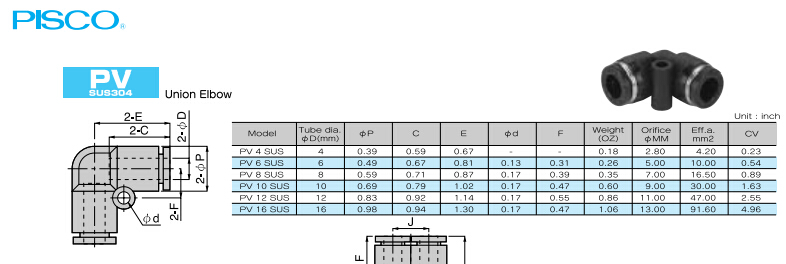 PV4SUS,PV6SUS,PV8SUS,PV10SUS,PV12SUS,PV16SUS,PISCO快速接頭
