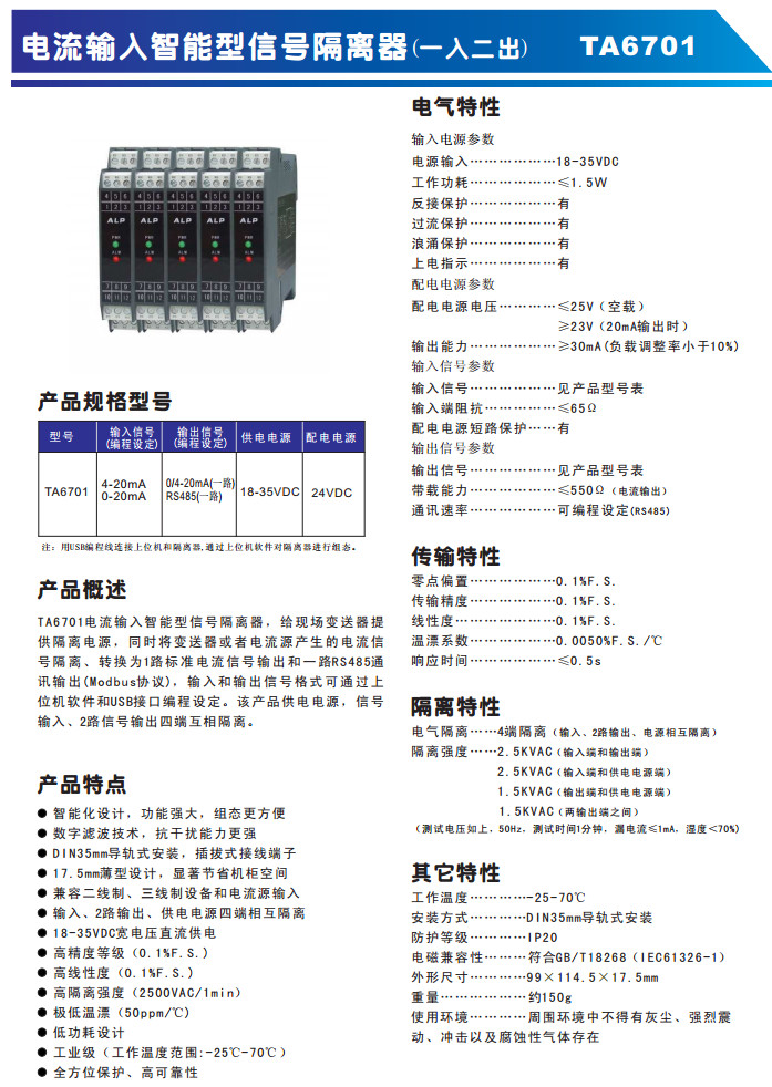 TA6701,電流輸入智能型信號(hào)隔離器(一入二出)