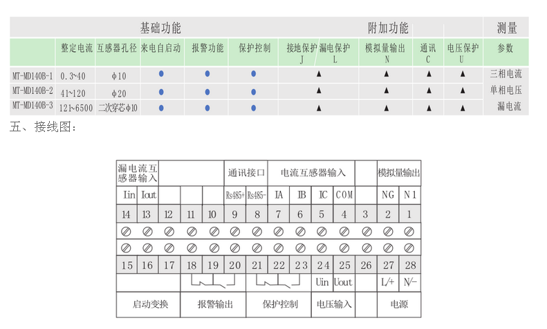 該產(chǎn)品具有過壓保護(hù)、欠壓保護(hù)、斷相保護(hù)、三相不平衡保護(hù)、堵轉(zhuǎn)保護(hù)、短路保護(hù)、欠流保護(hù)、過流保護(hù)、來電自啟動(dòng)、報(bào)警功能、保護(hù)控制、接地及漏電保護(hù)、模擬量輸出、通訊功能、電壓保護(hù)及參數(shù)測(cè)量。