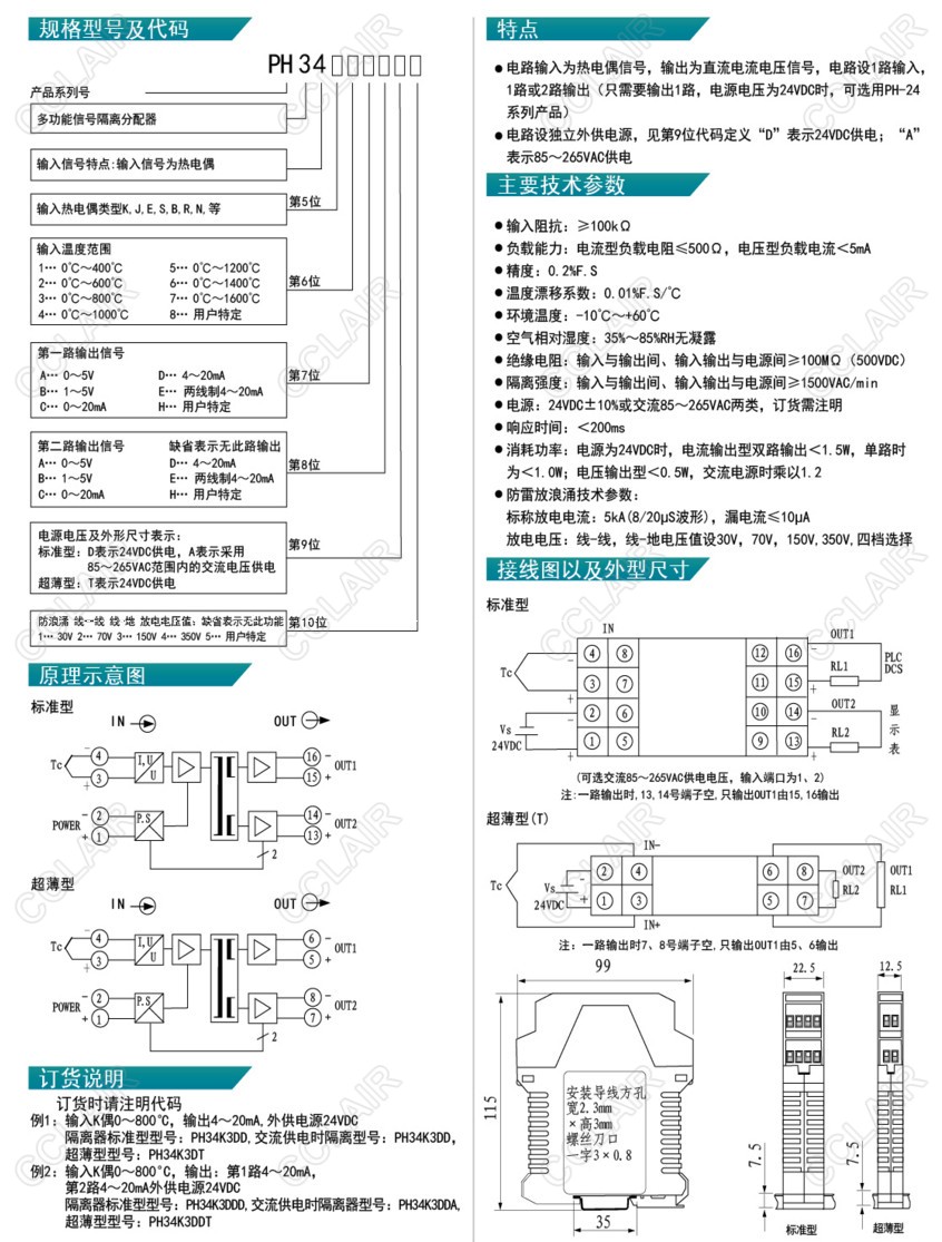 PH34K3DD,PH34K3DA,PH34K3DT,PH34K3DDD,PH34K3DDA,PH34K3DDT,PH-34,熱電偶信號隔離分配器
