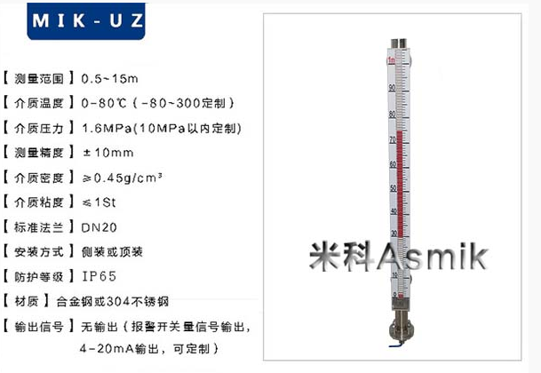 MIK-UZ磁性浮子液位計適用于開放或壓力容器內(nèi)的液體測量。該系列產(chǎn)品可以做到高密封、防泄漏和在高溫、高壓、高粘度、強腐蝕性條件下安全可靠地全過程測量液位。無盲區(qū)、顯示醒目、讀數(shù)直觀、測量范圍大。 可選配液位開關(guān),實現(xiàn)液位上下限報警和控制;可選配液位變送傳感器,將液位信號轉(zhuǎn)換成二線制(4~20)mA標準信號,實現(xiàn)遠距離檢測,指示記錄和控制。 該系列產(chǎn)品廣泛應(yīng)用于電力、石油、化工、冶金、環(huán)保、船舶、建筑、食品等各行業(yè)生產(chǎn)過程中的液位測量與控制。