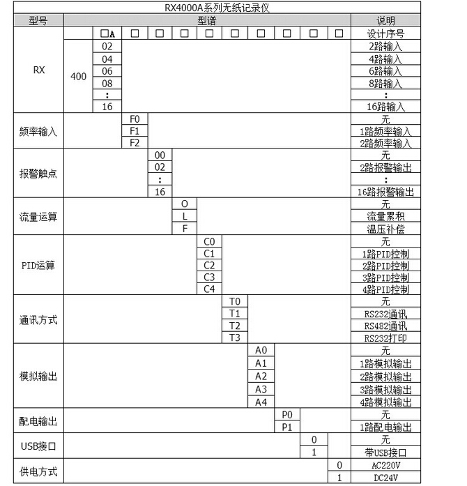 例如:RX4007A-FO-02-L1-T2-A0-P1-1-0 表示
