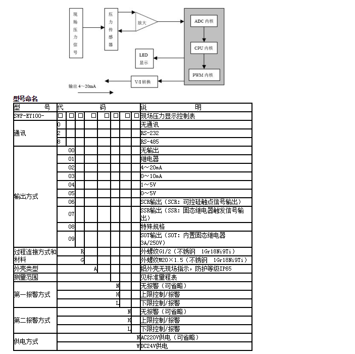 儀表通過壓力傳感器把壓力信號變?yōu)殡娦盘枺儆汕爸梅糯笃靼汛穗娦盘柗糯鬄V波,送往CPU的A/D轉(zhuǎn)換模塊進行模擬量到數(shù)字量的變換。最后由CPU進行數(shù)據(jù)處理并顯示及PWM輸出。原理框圖如下: