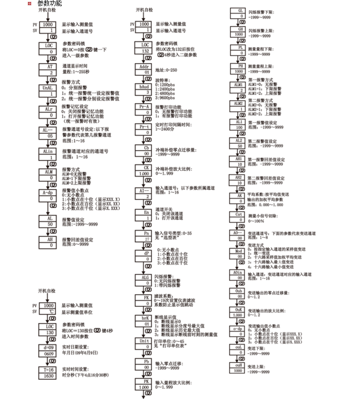 NHR-5920系列多回路臺式打印控制儀采用先進(jìn)的微處理器進(jìn)行智能控制,集打印、控制及測量顯示于一體,本機(jī)包含多路測量顯示控制儀的全部功能,增加了現(xiàn)場打印記錄功能,可以自動定時打印或手動即時打印各通道當(dāng)前測量值,適用于需在要進(jìn)行多測量點(diǎn)巡回檢測的系統(tǒng)。 雙屏LED數(shù)碼顯示,PV顯示測量值,SV顯示當(dāng)前通道號。 可巡回檢測8~16路測量信號,各輸入通道測量信號互不干擾。 具備36種信號輸入功能,各通道可同時輸入不同的信號類型;0.2%級測量精度。 報警方式可選擇8路或16路“統(tǒng)一報警輸出”、“16路分別報警輸出”,“統(tǒng)一報警輸出”時通過參數(shù)設(shè)置可選擇帶記憶報警和不帶記憶報警功能,儀表面板帶LED報警指示燈。 變送輸出方式可以選擇“統(tǒng)一變送輸出”、“8路分別變送輸出”,“按指定輸入通道的采樣值變送”、統(tǒng)一變送、“16路采樣值加權(quán)平均變送”、“16路輸入最大值變送”、“16路輸入最小值變送”。 儀表數(shù)據(jù)刷新周期2秒/16路。 儀表帶RS232C打印功能,具有手動打印、定時打印、報警打印功能。 帶DC24V饋電輸出,為現(xiàn)場變送器配電。 輸入、輸出、電源、通訊相互之間采用光電隔離技術(shù)。 參數(shù)設(shè)定密碼鎖定,參數(shù)設(shè)置斷電永久保存,具有參數(shù)恢復(fù)出廠設(shè)定功能。