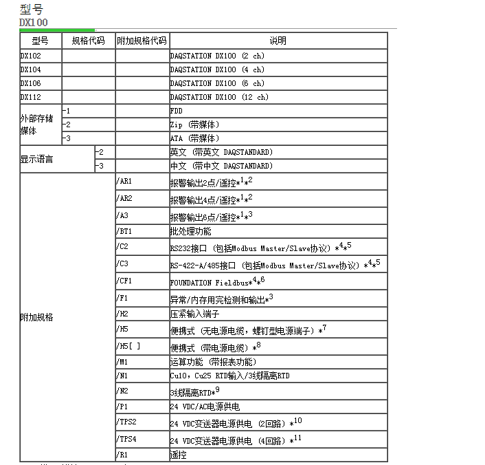 | *1 不能同時指定/AR1、/AR2和/A3。 *2 指定/AR1或/AR2后,不能指定/R1。 *3 指定/A3后,不能指定/F1。 *4 不能同時指定/C2、/C3和/CF1。 *5 使用Modbus Master功能,必須指定/M1。 *6 指定/CF1后,必須同時指定/M1。 *7 同時指定/P1和便攜式時,必須指定/H5不能同時指定/P1和/H5[ ]。 *8 /H5[D、F、R或J ] D:電源線UL、CSA標準 F:電源線VDE標準 R:電源線SAA標準 J:電源線BS標準 *9 不能對DX102和DX104指定/N2 *10指定/TPS2后,不能指定/TPS4,/AR2或/A3。 *11指定/TPS4后,不能指定/TPS2,/AR2,/A3或/F1。 |