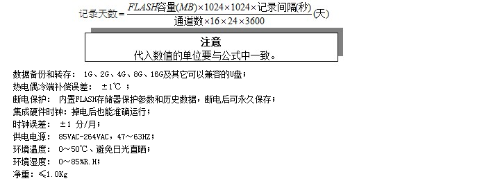 記錄時(shí)間:記錄時(shí)間的長(zhǎng)短與FLASH存儲(chǔ)器容量、輸入點(diǎn)數(shù)、記錄間隔有關(guān),計(jì)算公式如下: