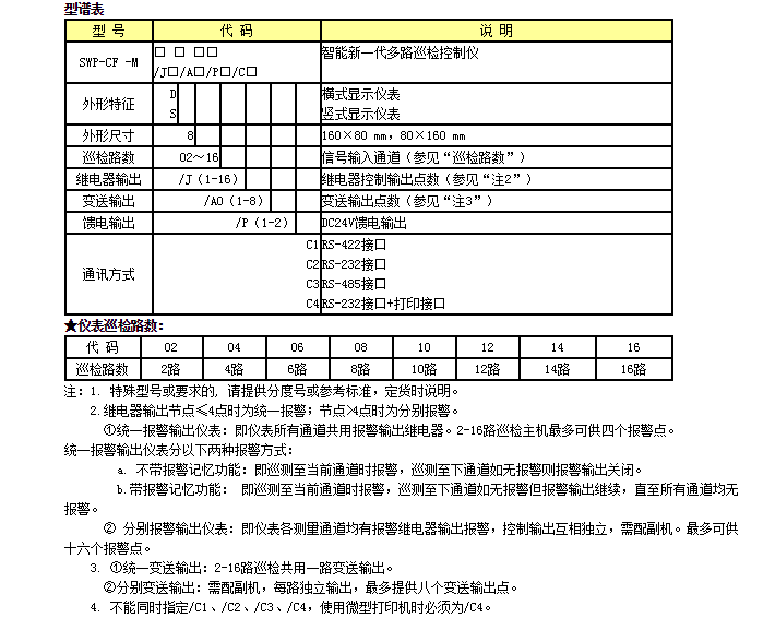 SWP-CF-M系列多路巡檢控制儀可選擇輸入通道同意報(bào)警控制輸出或各輸入通道分別報(bào)警控制輸出;可選擇輸入通道同意變送輸出或各輸入通道分別變送輸出。
