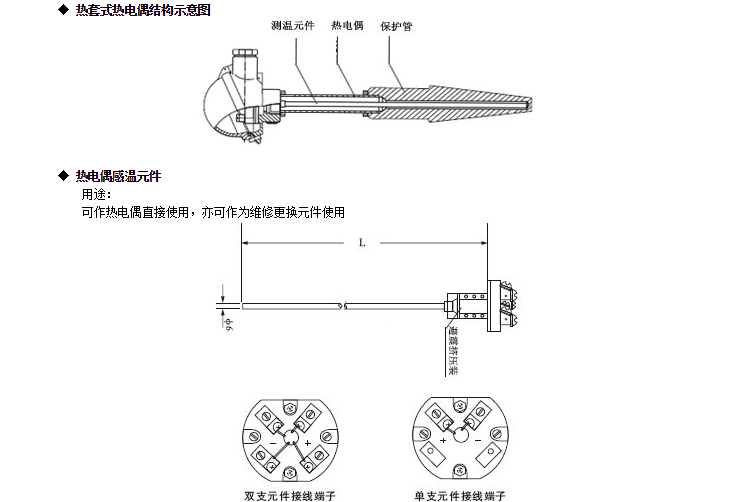 熱電偶采用熱套保護管與電偶可分離分工,使用時,用戶可將熱套焊接或機械固定在設(shè)備上,然后裝上電偶就可工作,它的優(yōu)點是提高了保護管的工作壓力和使用壽命,又便于電偶的維修或更換,目前這種結(jié)構(gòu)形式被國外廣泛采用。