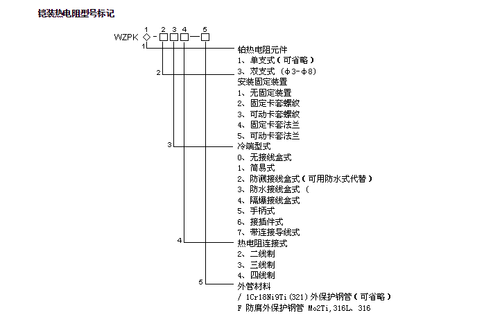 WZPK系列鎧裝鉑熱電阻標(biāo)準(zhǔn)外徑尺寸和套管材質(zhì)