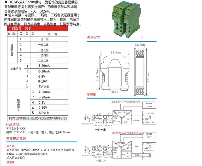 輸入輸出方式:一入一出、一入二出、一入三出、一入四出、二入二出輸出范圍:0-10V、4-20mA、0-20mA、0-5V等用戶需要的標(biāo)準(zhǔn)信號