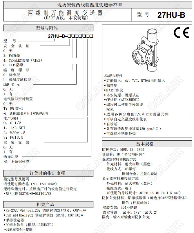27HU-B,27HU-B-7652,CELENEC隔爆型防爆認證 接線盒內安裝型萬能輸入信號變換器27HU-B-0,27HU-B-3,27HU-B-4,27HU-B-8,