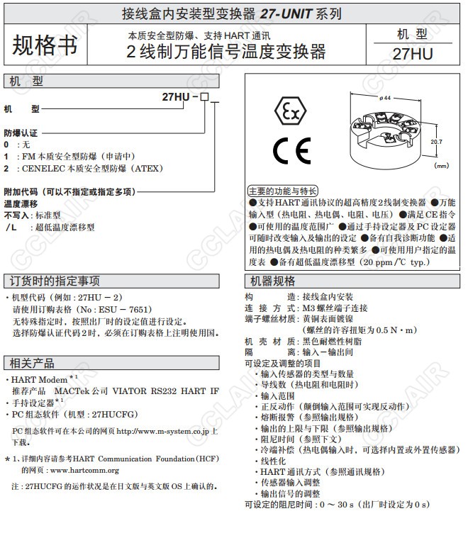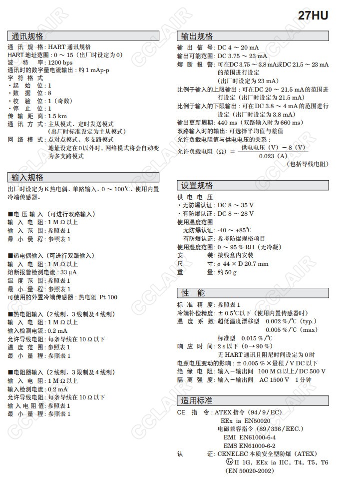 27HU,27HU-0,取得FM,CELENEC本質(zhì)安全型防爆認證 接線盒內(nèi)安裝型萬能輸入信號變換器27HU-1,27HU-2