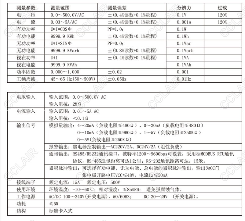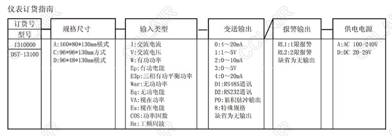 DST-13100系列單相電量表可外接電壓、電流互感器的標準信號或直接接入電流5A、電壓500V的交流信號, 并通過專用的電量計量芯片可測量有功功率、三相有功平衡功率、無功功率、視在功率、功率因數(shù)、工頻周波 、有功電能、無功電能和總電能,并在型號上對每個功能做了明確的細分。輸出功能可選模擬量輸出、通訊輸 出和累積脈沖輸出功能,配備RS232/485通訊接口,支持標準MODBUS RTU通訊協(xié)議,可組網(wǎng)實現(xiàn)數(shù)據(jù)的集中管理 ;可帶欠壓和過載事件報警功能。 本產(chǎn)品采用工業(yè)級元器件,所有與外界的連接都做了電氣隔離,內(nèi)置抗雷擊保護電路和電源濾波器。可靠的 端子輸入,接線端子采用國外進口插拔式端子,具備高耐壓和過流等級的特點。專業(yè)的EMC設計,對裝置輸入電 源、模擬和數(shù)字電源進行實時的監(jiān)測,保證了其運行的可靠性??茖W的自診斷功能,可通過顯示代碼表明產(chǎn)品 的故障。適用于成套智能高、低壓配電柜、智能箱變、小家電性能檢測系統(tǒng)的數(shù)據(jù)采集。