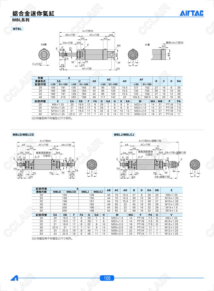 MBL20*10-CA,MBLC20*10-CM,MBLD20*10,MBLCD20*10,MBLCJ20*10,MSBL20*10-U,MTBL20*10-U,AIRTAC亞德客迷你氣缸