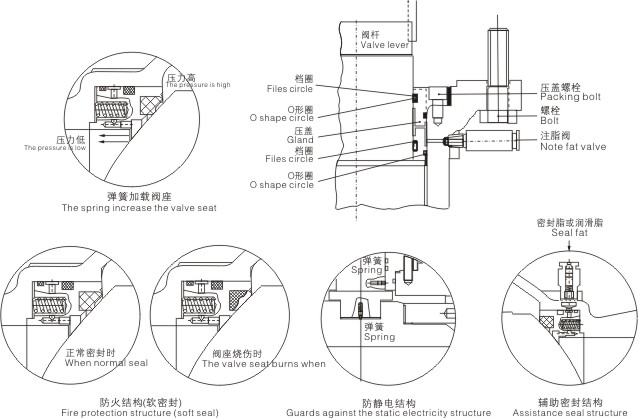 9、自動泄壓結構,當滯留在閥門中腔的液體介質由于溫度升高而氣化,從而中腔壓力異常升高時,中腔介質能依靠本身的推力推動閥座而自動泄壓,從而確保閥門安全。