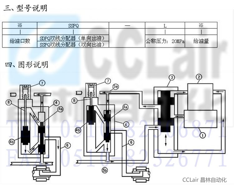 SSPQ-L系列分配器動作原理同上,供油管5a、5b分別供油一次其下部和正面給油口分別排油一次。