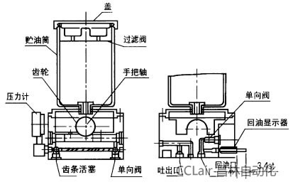 | 手動(dòng)潤(rùn)滑泵是借人工擺動(dòng)手把,通過(guò)齒輪帶動(dòng)齒條活塞往復(fù)運(yùn)動(dòng)實(shí)現(xiàn)向外供油的,當(dāng)活塞處于圖示極限位置時(shí),潤(rùn)滑脂通過(guò)吸入口吸入并充滿活塞的右腔,當(dāng)活塞向右移動(dòng)時(shí),被吸入的潤(rùn)滑脂在油壓的作用下頂開(kāi)單向閥壓送至出口向外排出,當(dāng)系統(tǒng)中主分配器的一計(jì)量油口返回至回油指示器的油量達(dá)到3.2mL時(shí),指示桿全部伸出,證明系統(tǒng)所有潤(rùn)滑點(diǎn)已得到所需的潤(rùn)滑油量,此時(shí)停止操作手把并把指示桿向內(nèi)壓進(jìn),為下循環(huán)準(zhǔn)備,指示器內(nèi)的潤(rùn)滑脂經(jīng)單向閥返回貯油桶內(nèi)。 |