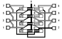 | 六、使用說明 1、在系統(tǒng)中推薦最多通過“兩級”來進(jìn)行潤滑劑的分配。 2、排出油口1和2始終不能關(guān)閉。 3、始終使用原配的排出油口油嘴零件組。 4、裝拆調(diào)換油嘴零件時(shí)要從每側(cè)的上部或最下部吐出口開始。 5、如果吐出口要補(bǔ)充關(guān)閉,合并潤滑劑量(改流到下面低數(shù)的吐出口排出),必須去掉油嘴體,用M10×1螺塞封堵按下圖范例連接。 |