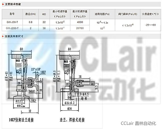 GW-J-T型系列高真空微調閥(又稱真空針閥)是靠螺桿傳動來調節(jié)錐形針和孔的縫隙長度,改變閥座流導值。是用來向真空系統(tǒng)中充氣并可精確調節(jié)進氣流量,以控制和調節(jié)系統(tǒng)內的真空度。