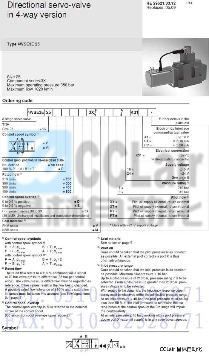 4WSE3E25V200D3X/VPT9/15K31A1,4WSE3E25V300D3X/VPT9/15K31A1,方向伺服閥,力士樂REXROTH,德國力士樂