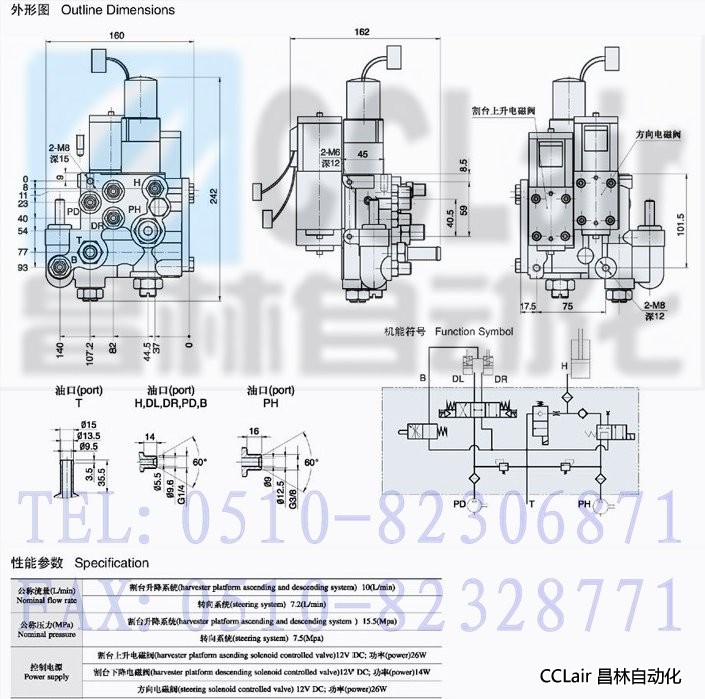 HCS6-12V電磁控制閥由方向電磁閥、割臺(tái)上升電磁閥和割臺(tái)下降電磁閥集成在閥體上構(gòu)成的。方向電磁閥的電磁鐵采用了單端