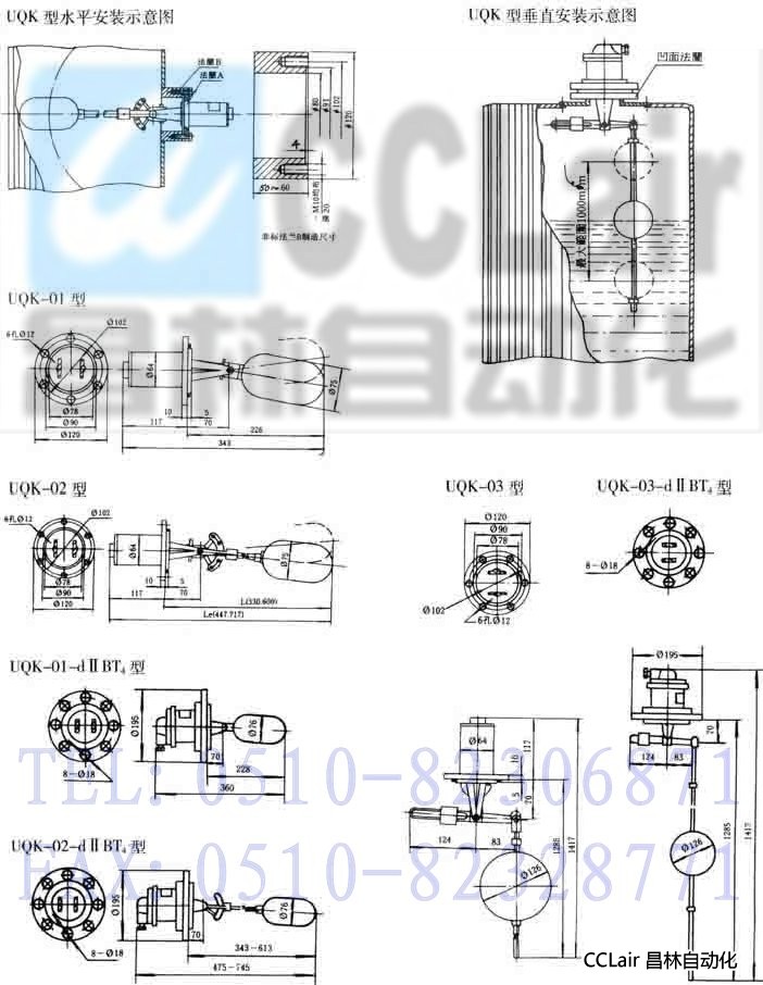 1. UQK-01/02/03型浮球液位控制器采用非標(biāo)凸面法蘭與被控容器相連接,用戶在安裝時應(yīng)配置相應(yīng)的下法蘭(凸緣) 2. UQK-01/02型控制器為水平方向安裝, UQK-03型為垂直方向安裝 .3. UQK-02型控制器的動作范圍的整定屬有級調(diào)整,最大動作范圍為550mm。 4. UQK-03型控制器在安裝時,因其浮球直徑大于法蘭孔直徑,故容器蓋應(yīng)為可拆裝。 UQK-02型的動作范圍的整定屬無級調(diào)整,最大動作范圍為1000mm。 5. 控制器是非防水型結(jié)構(gòu),不宜在室外露天場合使用。 6. 控制器在安裝時應(yīng)使金屬外殼可靠接地(一般可連在法蘭上),以確保用電安全。 7. 被控介質(zhì)不應(yīng)含有導(dǎo)磁雜質(zhì),并且液面的波動頻率不能太大。 8. 使用中的儀器應(yīng)定期進行檢查 。