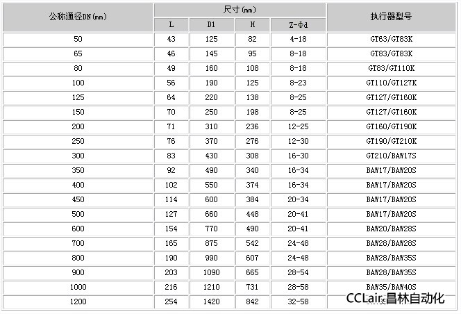 D673H氣動(dòng)硬密封蝶閥主要尺寸及執(zhí)行器配置