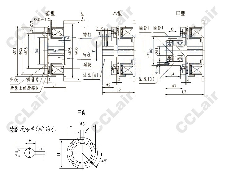 4) 安裝時不僅要保證磁軛安裝面與軸的垂直度,同時要保證動盤與磁軛的同軸度,動盤及法蘭(A)與軸的配*用H7/h6,并做好軸向定位,同時保證圖示δ與標(biāo)有0.8~1.5的間隙,大規(guī)格時標(biāo)有0.8~1.5的間隙取大值,法蘭(A)的緊定螺釘在擰入前要涂好防松膠;